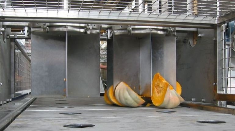 Un coltello verticale taglia le zucche a fette ( 4-6 fette ) e una fresa dal basso ( opzionale ) detorsola il picciolo.